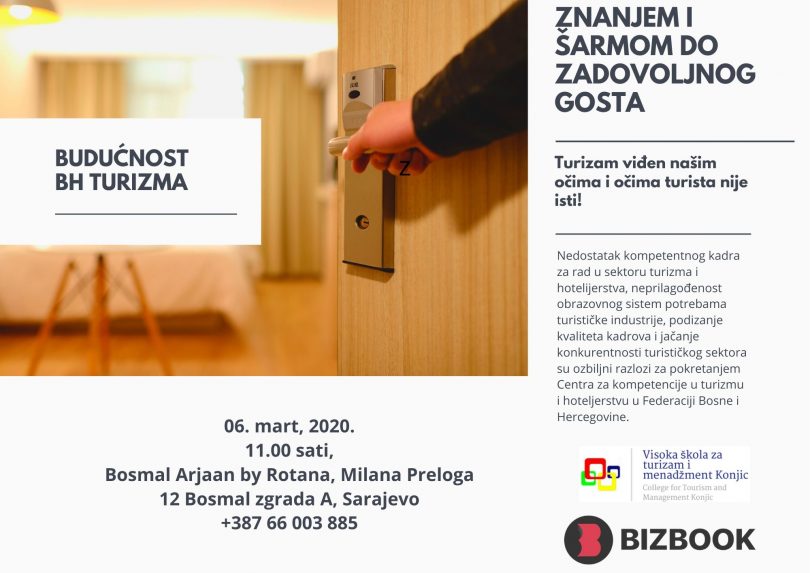 Zadovoljstvo nam je pozvati Vas na radionicu pod nazivom “Znanjem i šarmom do zadovoljnog gosta”, koja organizuje Visoka škola za turizam i menadžment Konjic u saradnji sa našim partnerima Bizbook.ba. U fokusu organizacije radionice je prikazati značaj komunikacije između obrazovnog sektora, te primjene iskoristivog znanja u oblasti hotelijerstva i turizma, sa ciljem osiguranja što kvalitetnije usluge i zadovoljnog gosta.